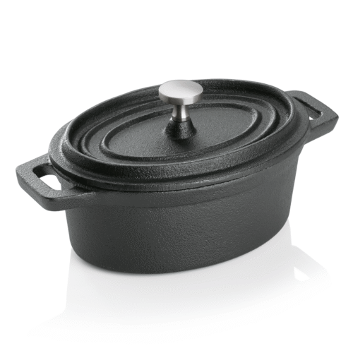 Artikelbezeichnungde: Cocotte, 12,5 x 9,5 x 6,5 cm, schwarz, Gusseisen, Edelstahl