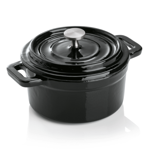 Artikelbezeichnungde: Cocotte, Ø 10 cm, Höhe 6,5 cm, schwarz, Gusseisen, Edelstahl, emailliert