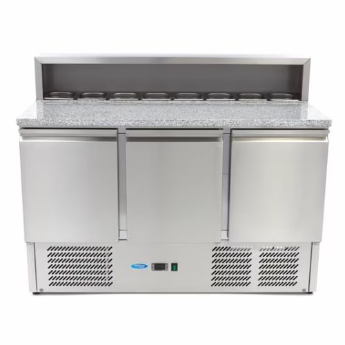 Ein Pizzatisch hat fast immer eine Granitplatte und ist tiefer gebaut, um Platz für das Ausrollen großer Pizzen zu bieten. Ein Saladeur hat meist eine Edelstahloberfläche und ist eher für das Belegen von Sandwiches oder Salaten optimiert.